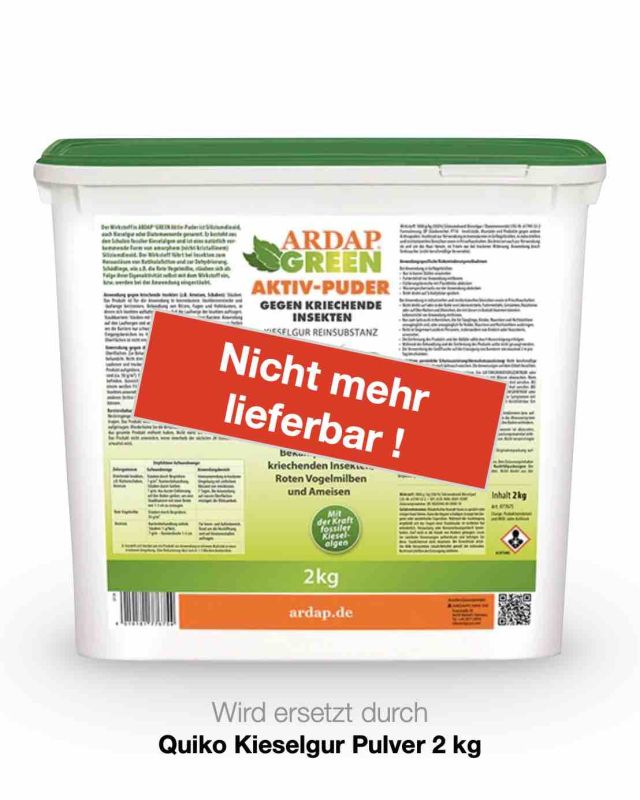ARDAP GREEN Aktiv-Puder ist ein nicht-chemisches Ungezieferbekämpfungsmittel zur Anwendung gegen kriechende Insekten, Milben, Vogelmilben, Flöhe, Zecken, Ameisen, Asseln, Silberfischchen, Kakerlaken, Bettwanzen usw. im Garten, Lager, in Ställen, Kellern und Wohnräumen. Der Wirkstoff in ARDAP GREEN Aktiv-Puder ist Kieselgur (auch Diatomeenerde genannt) – eine pulverförmige Substanz aus den Schalen fossiler Kieselalgen (Diatomeen), die zum größten Teil aus Siliciumdioxid bestehen und eine sehr poröse Struktur aufweisen.